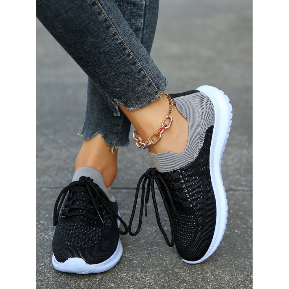 Sports Color Block Breathable Lace-Up Flat Heel Fly Woven Shoes